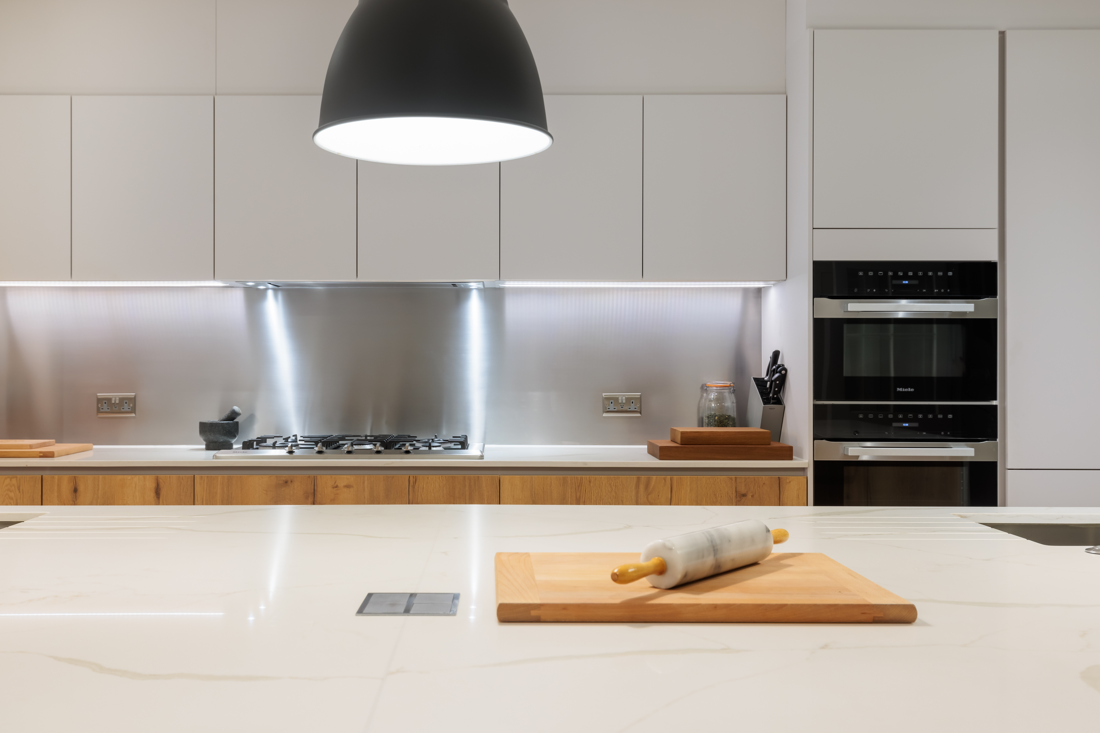 Our designers integrated a stainless-steel sink into the island, maintaining the kitchen's streamlined appearance with a stylish Quooker tap to provide durability and a touch of modernity.