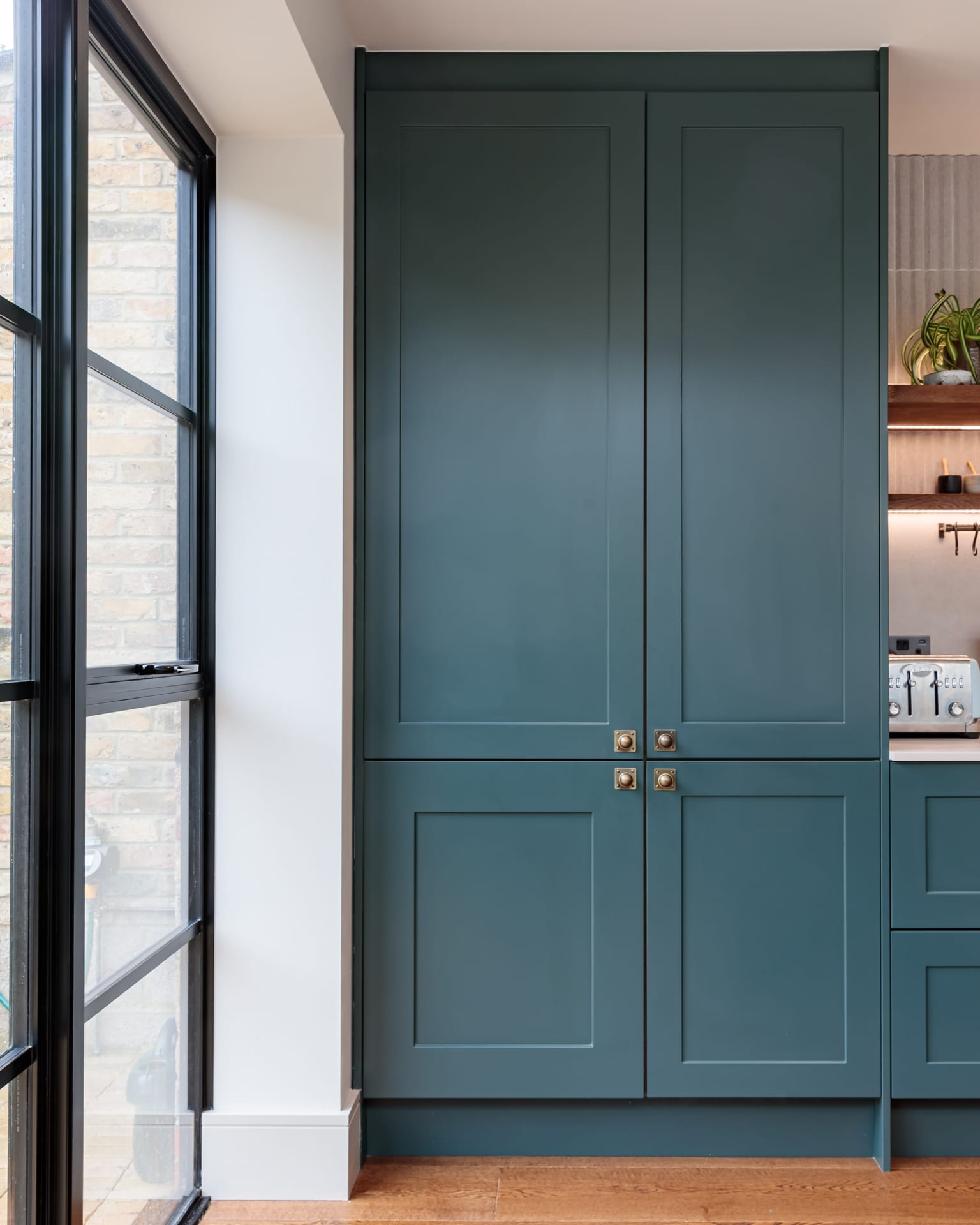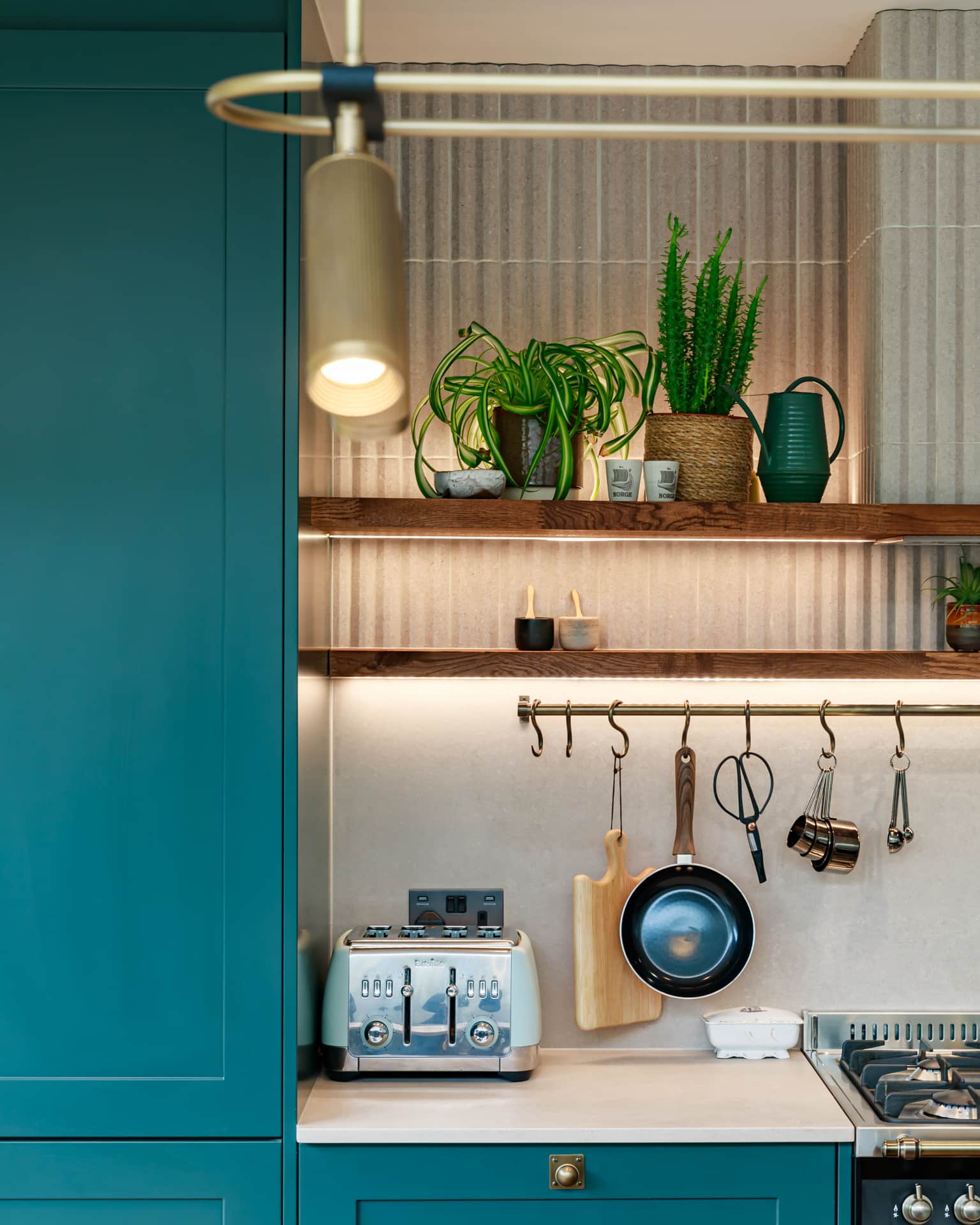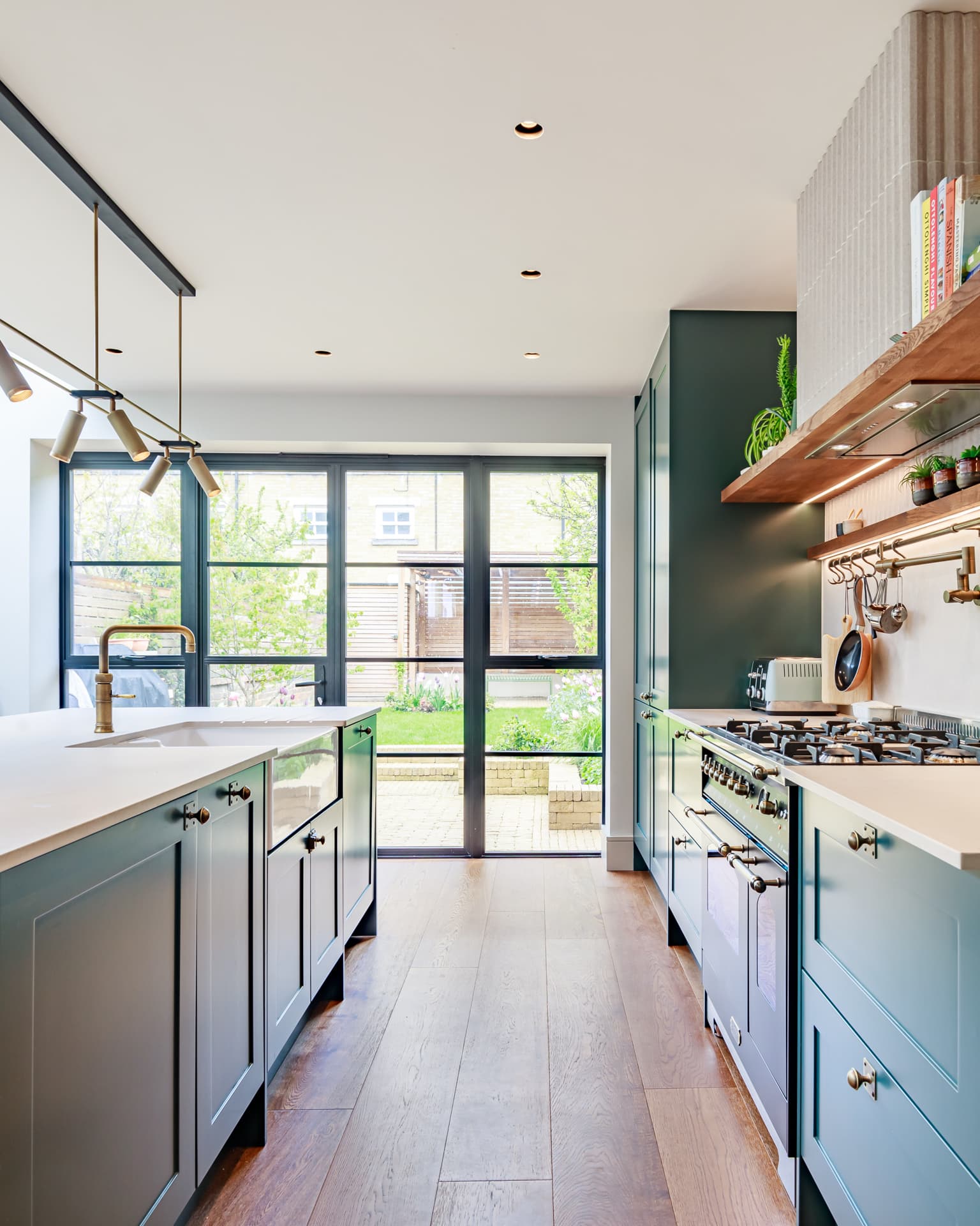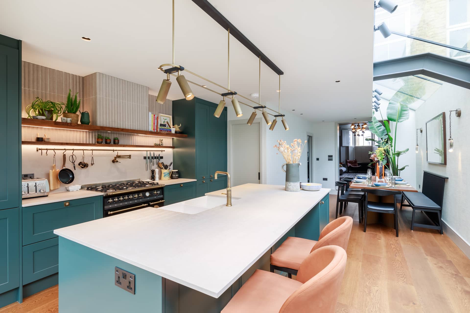 Mile end is a stunning project finished in the popular timeless classic Corpse Green; a perfect blend of earthy tones adorned with Brass accents all throughout the kitchen including the traditional Lofra range cooker. The feature piece is a bespoke cladded extractor fan with floating shelving with warm ambient lighting which adds to the warm homely atmosphere.