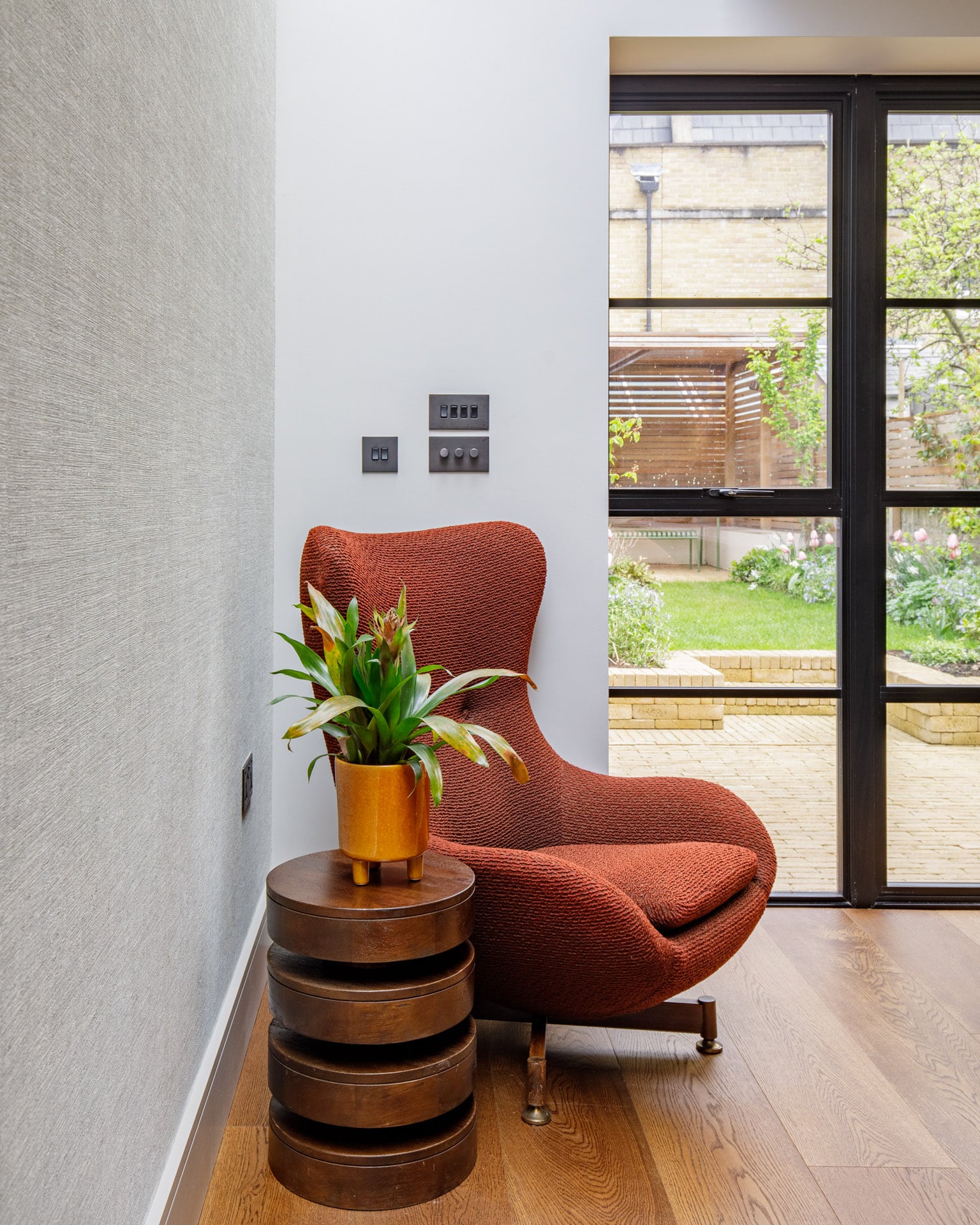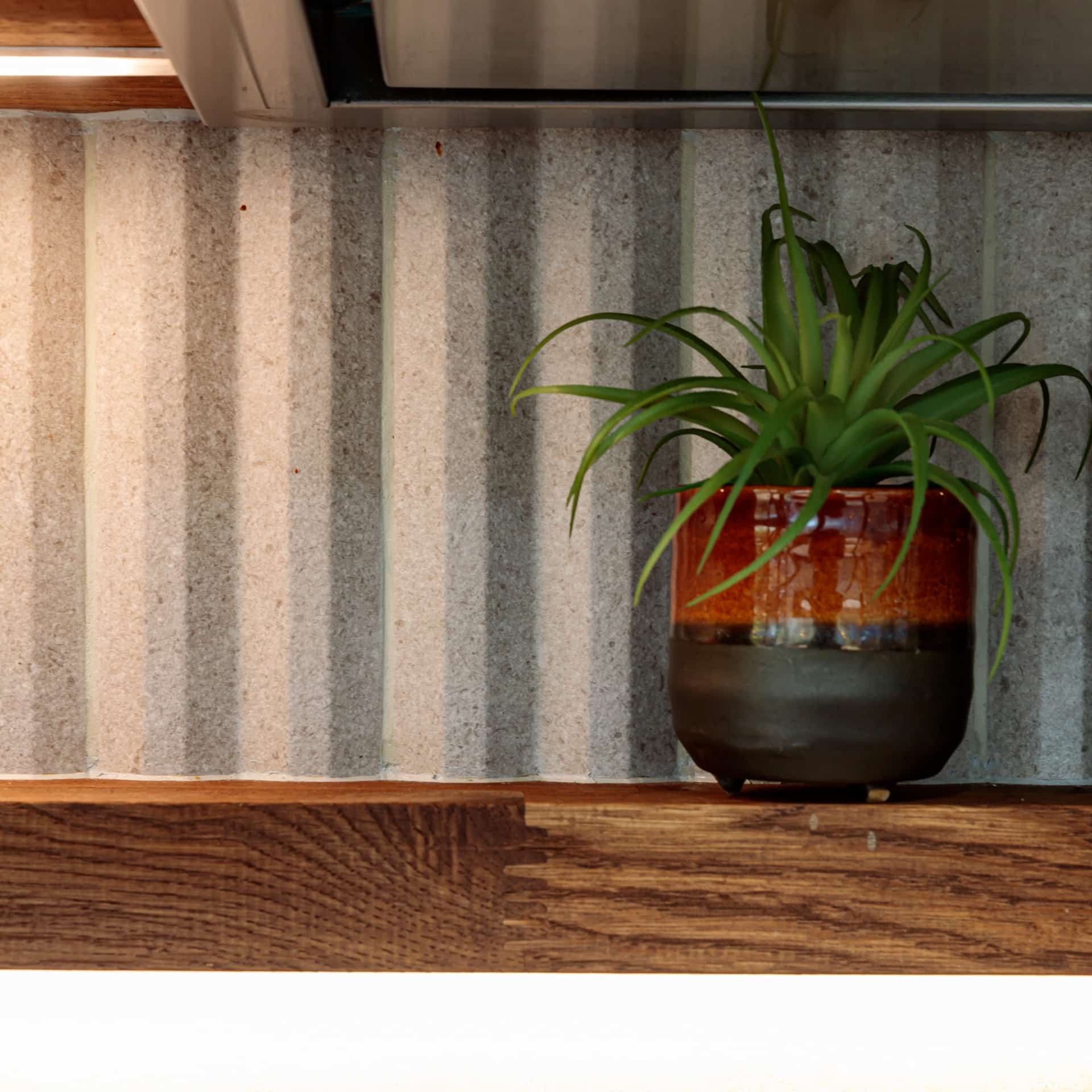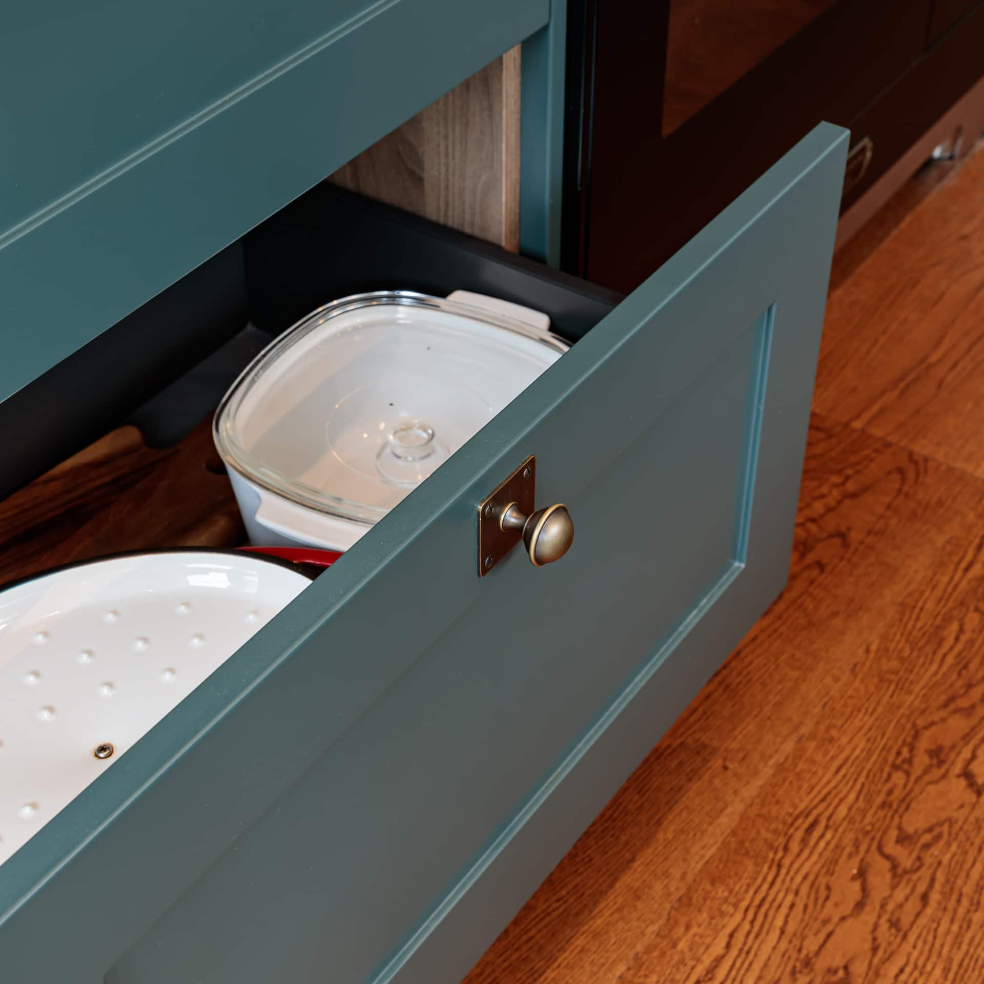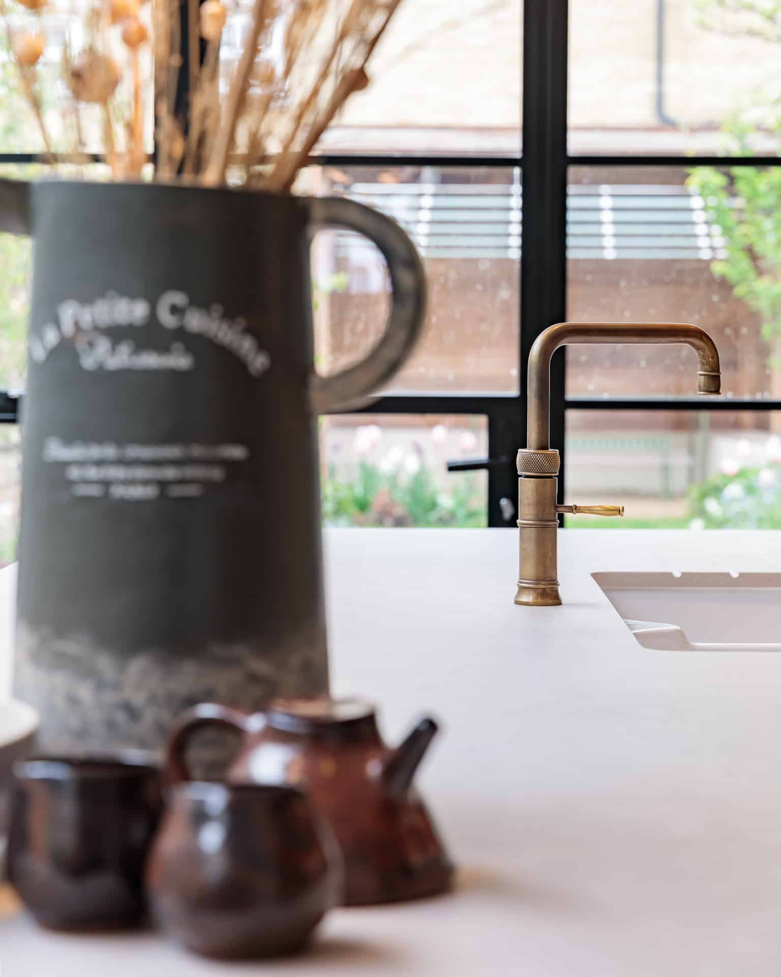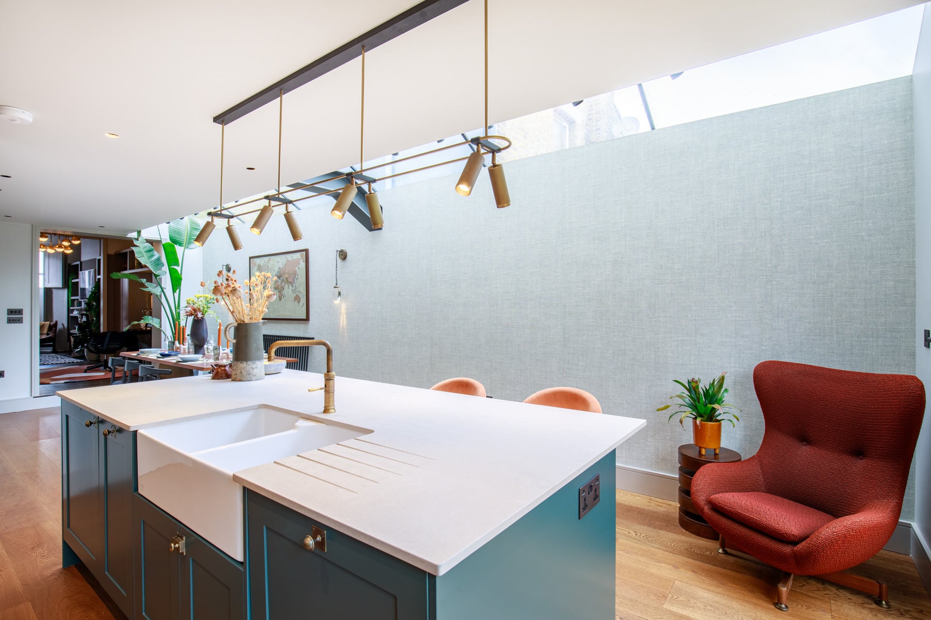 Mile end is a stunning project finished in the popular timeless classic Corpse Green; a perfect blend of earthy tones adorned with Brass accents all throughout the kitchen including the traditional Lofra range cooker. The feature piece is a bespoke cladded extractor fan with floating shelving with warm ambient lighting which adds to the warm homely atmosphere.
