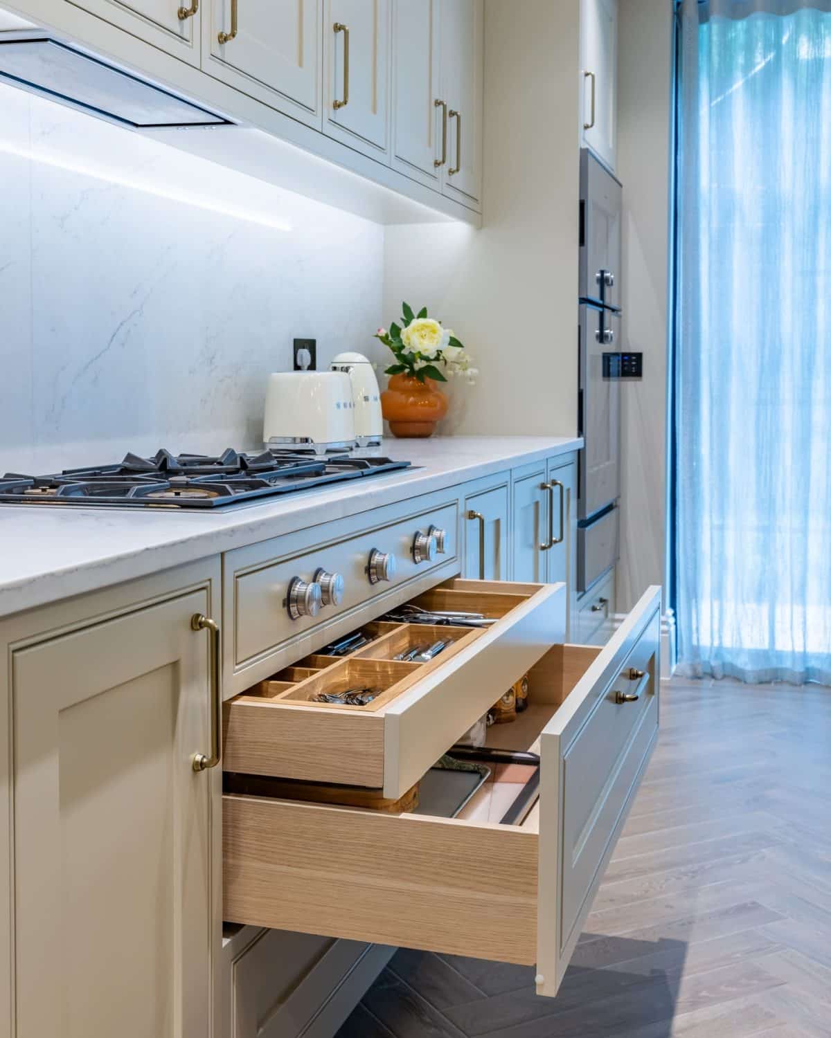 - Hidden drawers at skirting level for trays, tins, or infrequently used items